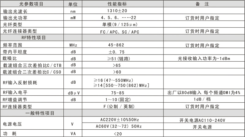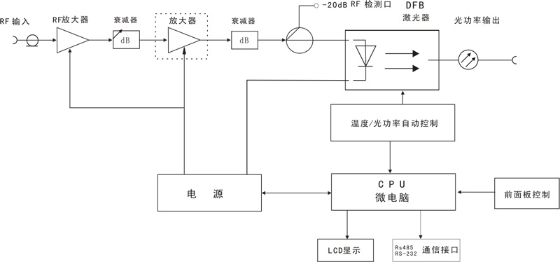 ⊙ RF輸入信號帶寬45-862MHz。 ⊙ 內設RF放大器,對光調制信號進行預處理,提高RF的信噪比和載噪比。 ⊙ 采用電子溫度自動控制系統,保證激光器內部溫度恒定。 ⊙ 光輸出功率采用閉環自動控制,輸出穩定性好,準確度高。 ⊙ 合理的設計和工作環境使激光器工作壽命長。 ⊙ 微電腦監測激光器所有工作狀態參數,液晶顯示器實時顯示各個參數的當前值。 ⊙ 激光器工作參數偏離規定值時給出相關信息并啟動自動保護電路。 ⊙ 遠程通信標準接口RS-232或RS485(可選) ⊙ 整機采用特殊的低功耗設計,提高了使用壽命和可靠性。 ⊙ 19# 標準機架設計,安裝方便。 ⊙ 該系列產品光輸出功率為4-22mW等多種規格供用戶選擇。 |