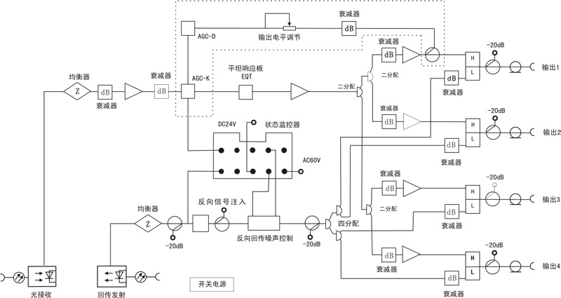 ⊙ 862MHz雙向寬帶工作平臺設計,下行4路RF高電平輸出,上行5路RF傳輸, ⊙ 回傳發射插件式設計,可隨時實現網絡升級(選件) ⊙ 配備網絡管理接口,可實現網絡狀態監測管理。 ⊙ RF增益和斜率控制插件式設計,方便用戶選擇。 ⊙ 帶AGC功能,控制范圍±3dB(選件)。 ⊙ 插件式雙向濾波器,多種頻率分割供用戶選擇。 ⊙ 配置CMTS射頻出口,便于組建數據網絡。 |
