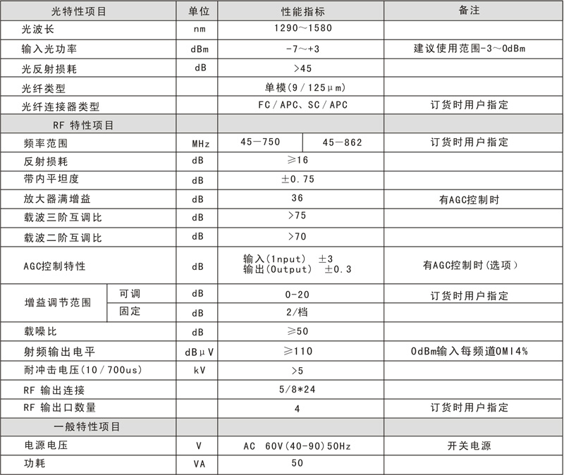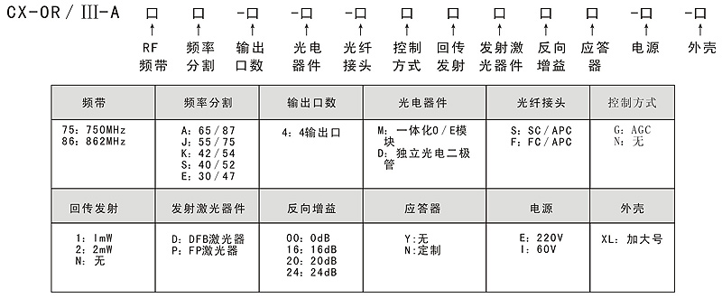 ☆ 若需要定制 :四路光接機,頻率750 MHz,頻率分割65/87,輸出口數4,一體化0/E模塊,光纖接頭FC/APC,帶AGC控制,回傳發射1mW,發射激光器為FB,反向增益16dB,不帶應答器,電源60V,加大號外殼,根據上述要求所需型號:CX-OR/Ⅲ-A-75A-4-M-FG1P16Y-I-XL。 ☆ 若您不習慣上述型號對應描述,也可以采用文字描述的方式向我們訂貨。 ☆ 技術參數如有更改,恕不另行通知。 |