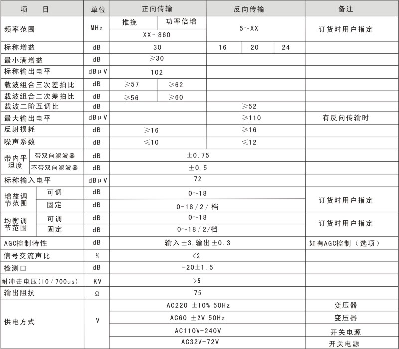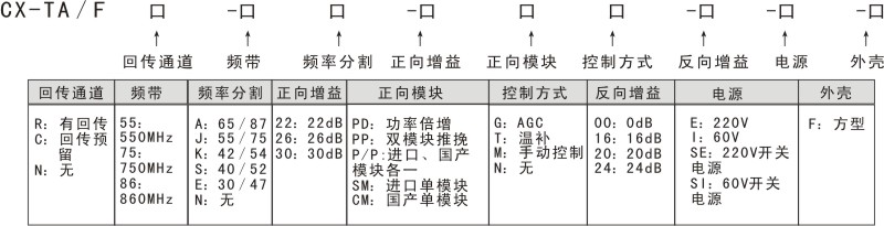 ☆ 若需要定制:帶回傳雙模塊雙向放大器,頻帶750MHz、頻率分割為5-65,87-750;增益30dB,采用雙模塊推挽,控制方式為手動控制,反向增益為16dB,并采用60V開關電源和方型外殼。根據上述要求,所需訂購放大器型號:CX-TA/F-R-75A-30PPM-16-SI-F