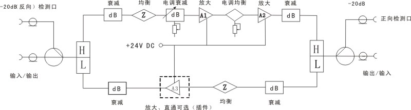 ⊙插件式衰減設計,正向通路設有電可調衰減器,增益調節范圍0-7dB.