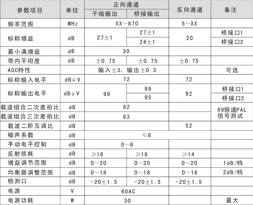 我公司推出的CX-TA/K型雙向橋接放大器正是適應HFC網絡的雙向傳輸的需求而研制的。該放大器具有高增益,可遠程狀態監控及回傳噪聲控制開關,自動增益控制(AGC)或溫度自動補償控制使RF信號在電纜傳輸中的損耗得到自動補償,確保輸出RF信號電平的穩定可靠。該放大器有一路高電平干線輸出和二路橋接分配輸出,以滿足網絡拓撲需要;該放大器將所有射頻部件全部安裝在一個內置式鑄鋁屏蔽盒內,便于產品升級和快速安裝維修。 |