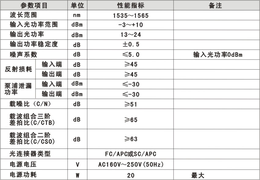 1)高品質(zhì):前級(jí)泵浦一般采用980nm,后級(jí)采用泵浦1480nm,功率通過(guò)軟件合理的優(yōu)化,****限度地降低EDFA的NF,可與所謂的低功率光放相媲美。可使系統(tǒng)獲得優(yōu)異的CNR;輸入輸出高度隔離。 2)可靠性:采用19″1U標(biāo)準(zhǔn)機(jī)架,內(nèi)置高性能的開(kāi)關(guān)電源,可在110∽265Vac市網(wǎng)電壓中工作,同時(shí)也可選DC48V供電(需預(yù)訂);機(jī)箱散熱可自動(dòng)溫度控制。 3)直觀性:泵浦激光器是整機(jī)最貴重的器件,機(jī)器內(nèi)設(shè)微處理器對(duì)泵浦激光器的工作狀態(tài)進(jìn)行監(jiān)控,工作參數(shù)由面板20x2字符LCD窗口顯示。 4)網(wǎng)管型:選件式狀態(tài)監(jiān)控應(yīng)答器保證滿足國(guó)標(biāo)并與 SCTE HMS標(biāo)準(zhǔn)兼容,可實(shí)現(xiàn)網(wǎng)管監(jiān)控功能。