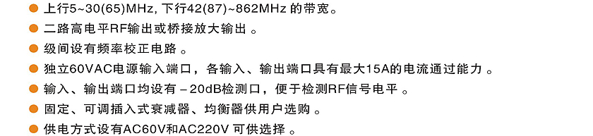 CX-TA/B干線放大器適用于HFC有線電視網(wǎng)絡(luò)中,作為干線放大及樓幢放大。其工作頻率范圍為5~862MHz,雙輸出端均采用功率倍增模塊,可獲得較高電平及功率輸出。級間設(shè)計有頻率校正電路,使放大器帶內(nèi)平坦度更佳。