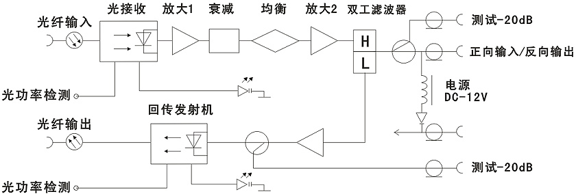 1)正向通道為xx~862MHz、反向通道為 5~xx MHz 的工作平臺設計。 2)良好的線性。 3)良好的平坦度;反射損耗。 4)消耗極低能量。 5)微型機箱。 6)外接穩壓電源(12-15VDC)。 7)一路輸出(75Ω阻抗)。 8)放大電路采用砷化鎵材料。 9)采用SC/APC接口。 10)有光功率強弱顯示及測量,有-20dB的正、反向測試口,便于操作。 |