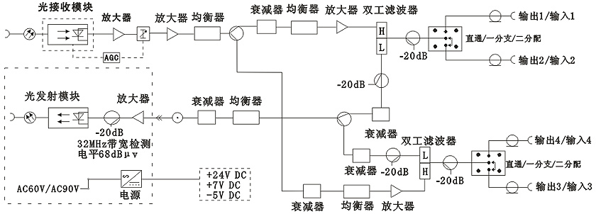 1)射頻輸出電平采用光自動增益控制(AGC),在同一個光網絡中任意光節點,只要光功率在-7dBm~+2dBm的范圍內,均不用調整本機衰減器的衰減量,就能保證整機輸出電平一致,CTB、CSO基本保持不變,大大方便工程調試。 2)正向通道為xx~1000MHz、反向通道為 5~xx MHz 的工作平臺設計。 3)插件式回傳發射結構可隨時實現網絡升級(選件)。 4)插件式雙向濾波器,多種頻率分割供用戶選擇;衰減器和均衡器為插件式設計。 5)低噪聲放大匹配電路和進口輸出級優良的砷化鎵放大模塊,確保輸出信號CTB、CSO符合國家標準。 6)正向通道、反向通道設計-20dB檢測口,可供在線檢測。 7)內供電方式設有60VAC/90V AC,外供電110VAC/220V AC開關電源可選。 8)二路獨立高電平RF信號輸出,或四路RF信號輸出經濟實用。 |