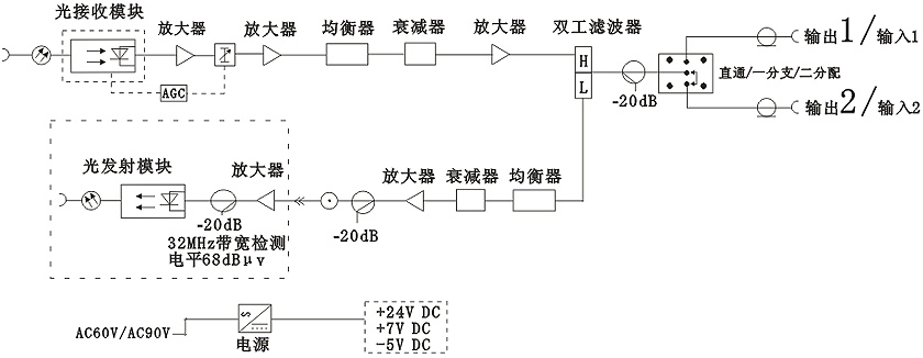 1)射頻輸出電平采用光自動增益控制(AGC),在同一個光網絡中任意光節點,只要光功率在-7dBm~+2dBm的范圍內,均不用調整本機衰減器的衰減量,就能保證整機輸出電平一致,CTB、CSO基本保持不變,大大方便工程調試。 2)采用GaAs器件,機內溫度低,防止光纖老化變形,從而延長了光接收機的壽命。 3)正向通道為xx~1000MHz、反向通道為 5~xx MHz 的工作平臺設計。 4)插件式回傳發射結構可隨時實現雙向網絡升級(選件)。 5)光接收采用PIN光電二極管,設有光功率顯示。 6)插件式雙向濾波器,多種頻率分割供用戶選擇;衰減器和均衡器為插件式設計。 7)正向通道、反向通道設計-20dB檢測口,可供在線檢測。 8)內供電方式設有60VAC/90V AC,外供電110VAC/220V AC開關電源可選。 |