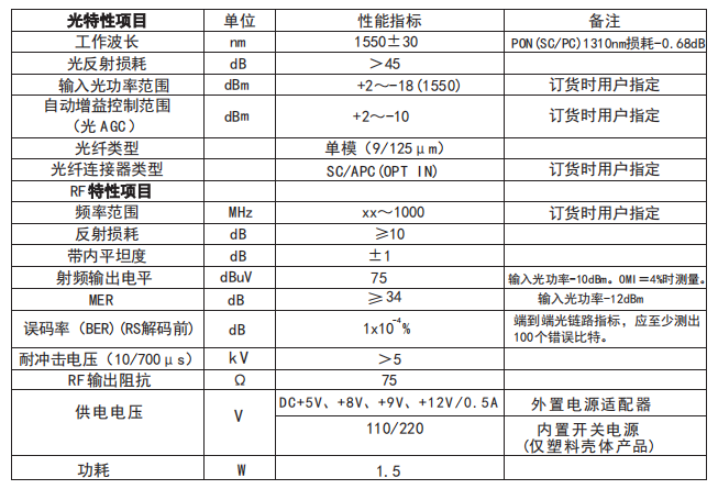 ●單纖三波傳送,CATV工作光波長1550nm,數(shù)據(jù)上下行光波長1310/1490nm; ●一體化鋅合金或塑料殼體可選; ●可采用內(nèi)置開關(guān)電源或外置電源適配器供電; ●1個光輸入口,光適配器SC/APC、FC/APC、SC/PC、FC/PC(可選) ; ●1個光輸出口,光適配器SC/PC、FC/PC(可選) ; ●1個外螺紋F頭式RF輸出口,公制、英制可選; ●用戶可根據(jù)需求進(jìn)行產(chǎn)品定制。 |